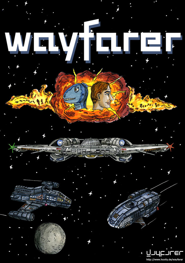This poster or wayfarer is showing the ship with Captain Trajev and First Officer Commander Buldidup as well as a crashian pitbull class gunboat and a redaquarian spaceshark class cruiser.